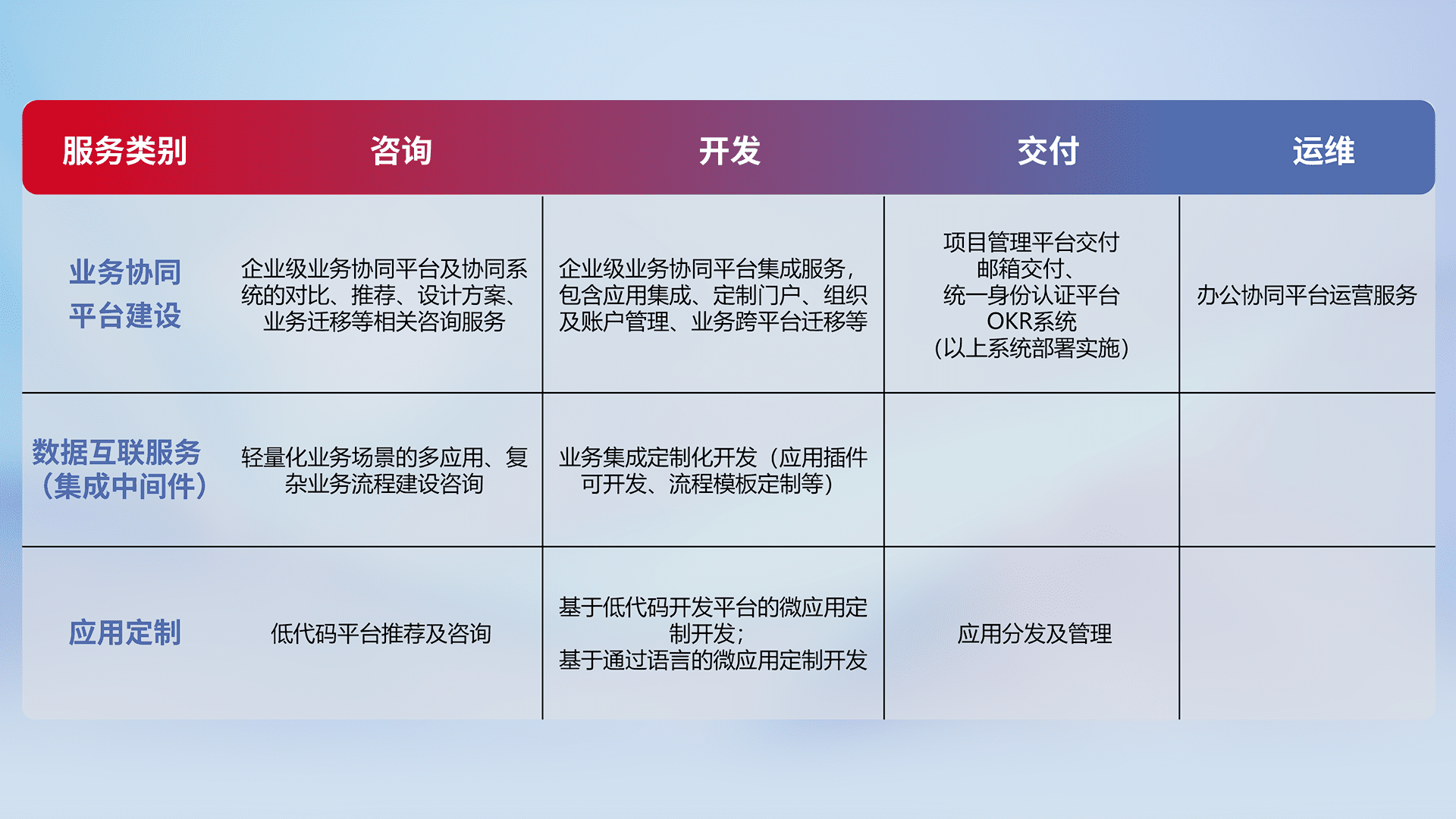 针对钉钉、、企微、、、IDaas等平台级产品提供产品的规划、、、方案、、交付、、定制化开发等服务,,实现如统一协同办公、、、、智能客户服务、、混合会议管理、、、、智能数据查询、、、等业务场景,,实现数字化转型。。